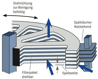 Beim Durchströmen der Lamellen lagern sich die Schmutzpartikel der zu filternden Flüssigkeit an der Oberfläche und in den Spalten ab. Dreht man den Filtereinsatz mit dem Handgriff, so sammelt sich der abgesetzte Schmutz an der Spalträumerreihe und sinkt in den Schlammsammelraum, wo er durch Öffnen eines Kugelhahns ausgetragen wird.
